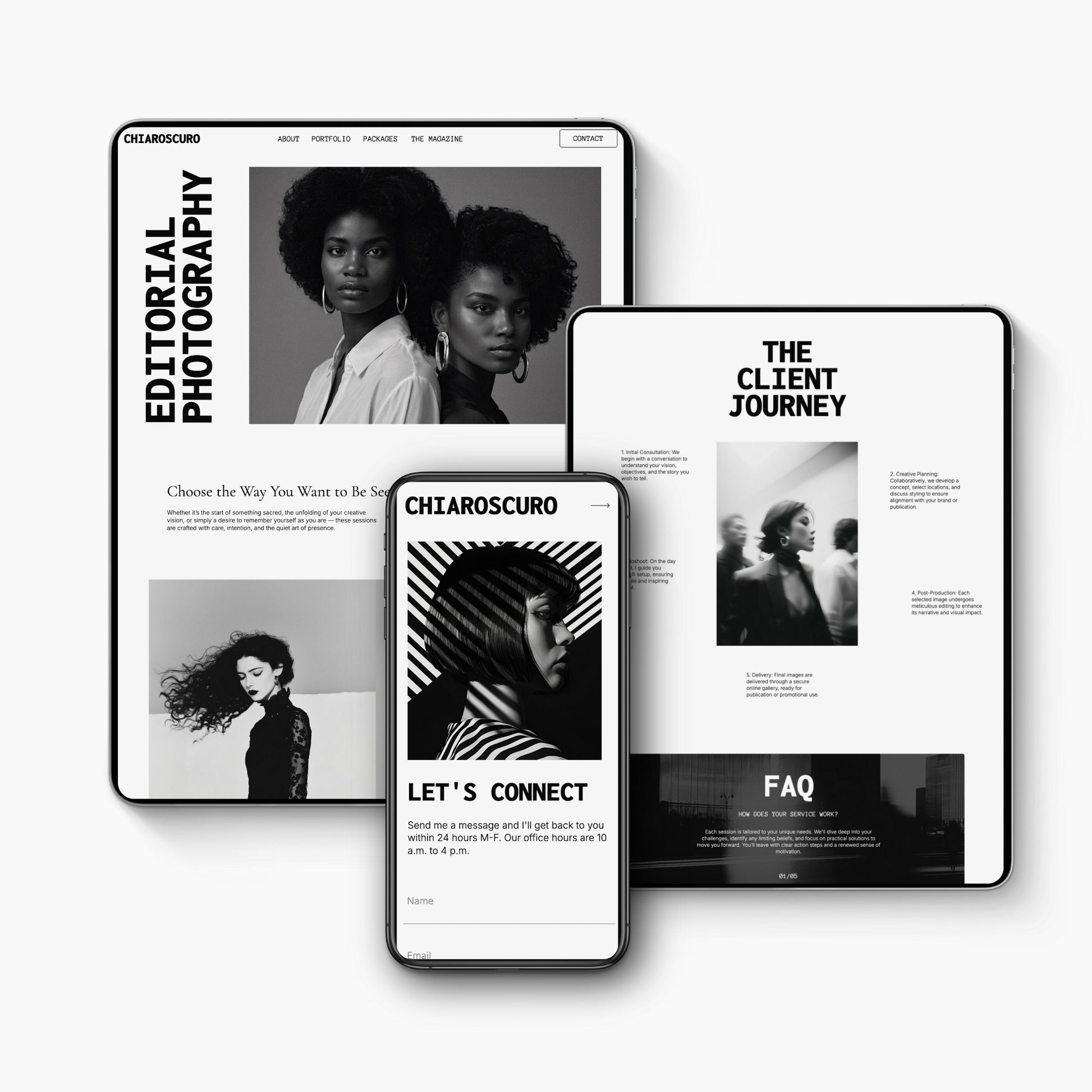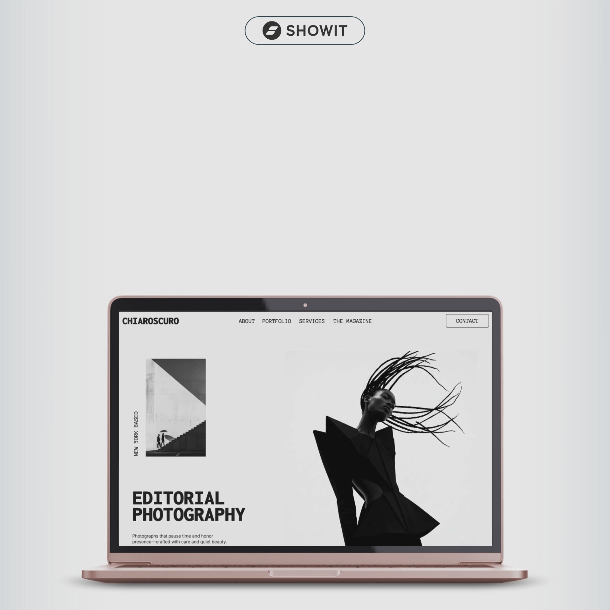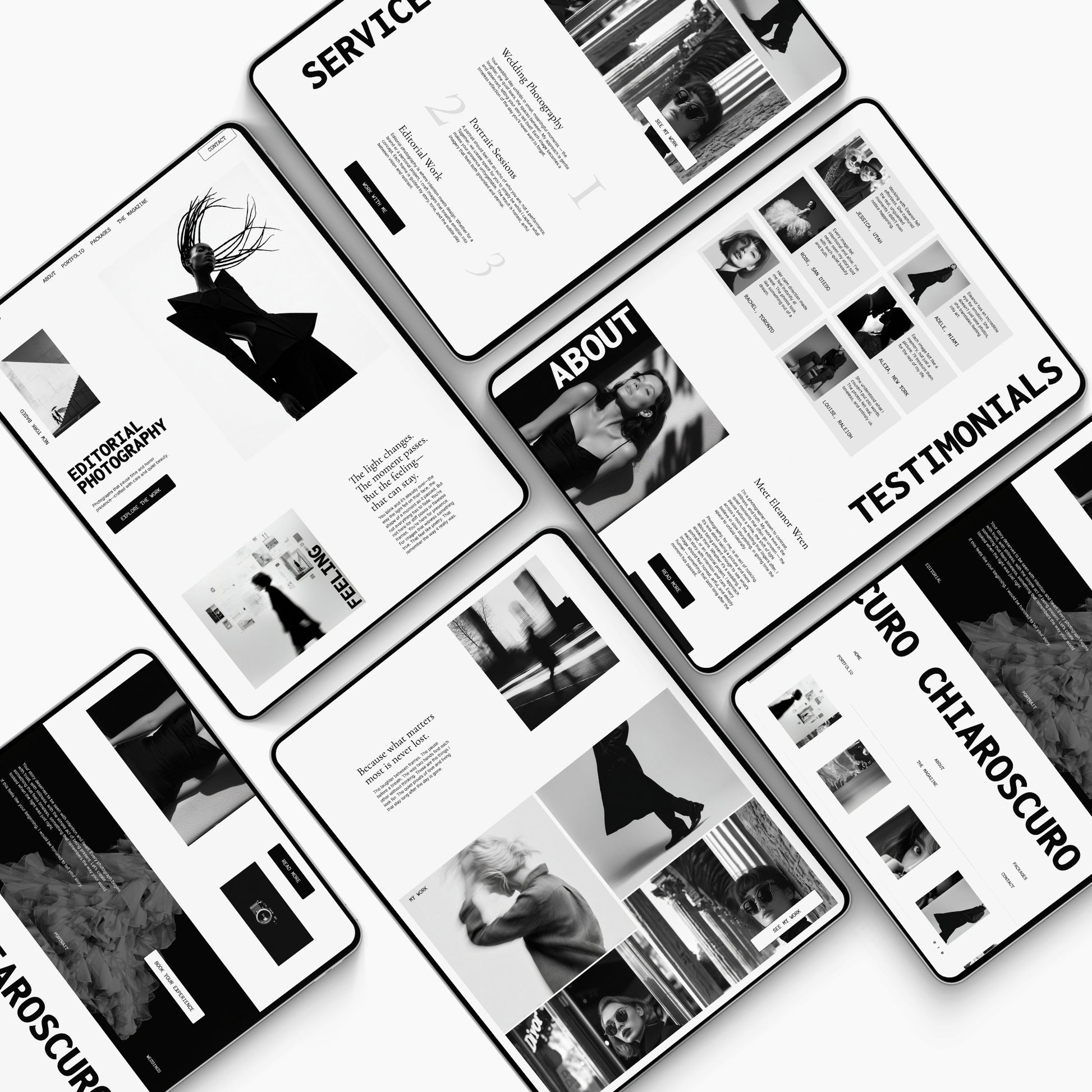 Chiaroscuro is a black-and-white Showit website template made for photographers who crave a striking, editorial online presence. Whether you shoot weddings, fashion, or fine art portraits, this template helps you showcase your work with gallery-like impact and magazine-level polish. No code required.